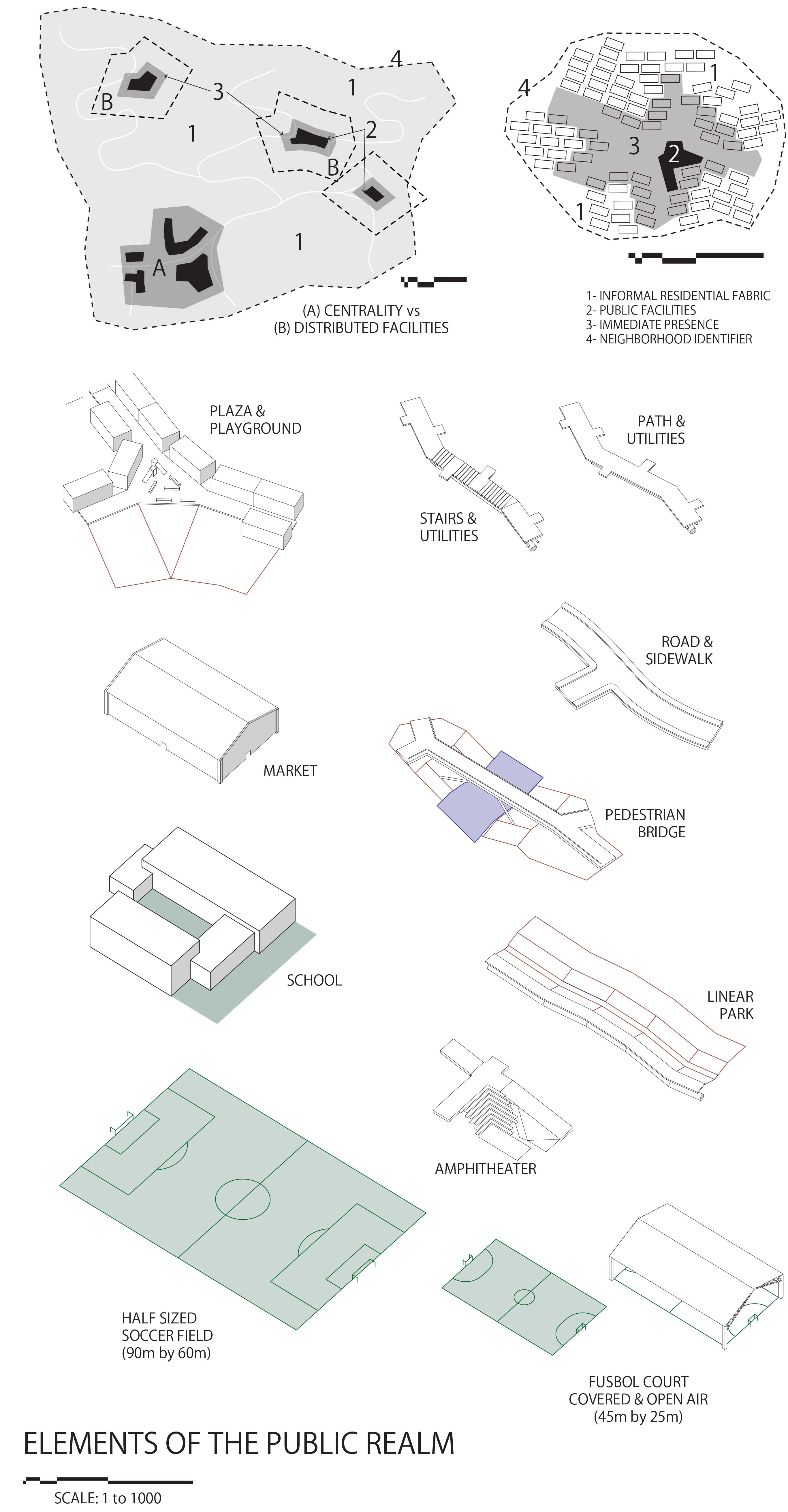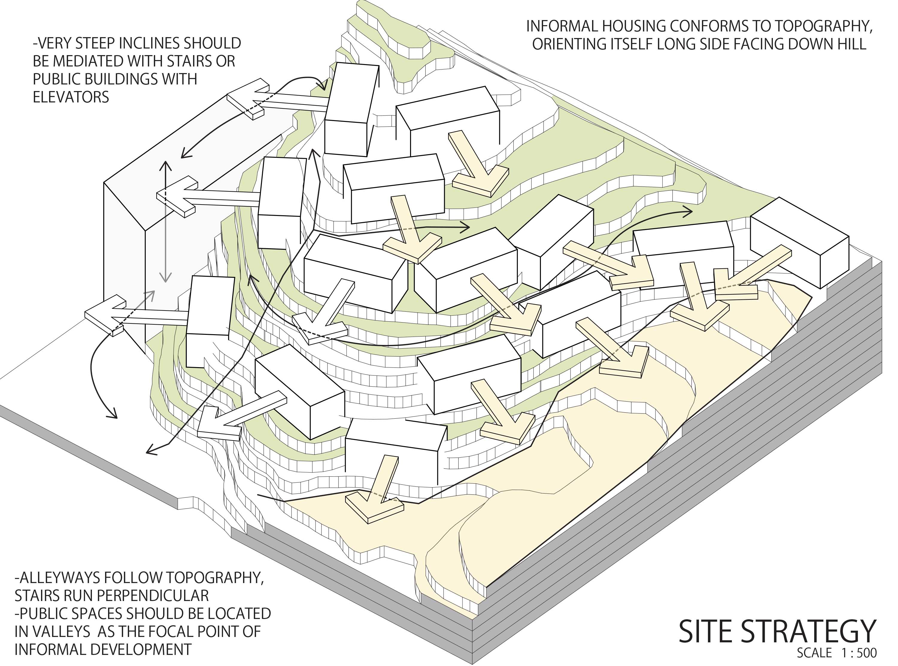 My own analysis, below, focuses on this pattern of plots and houses following the topographical contour lines of the hillside, and how public spaces and civic interventions should focus on the concave valleys of these hillsides to allow for the neighborhood to literally look in upon its civic spaces.