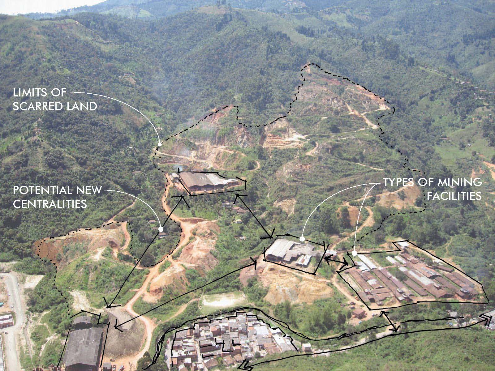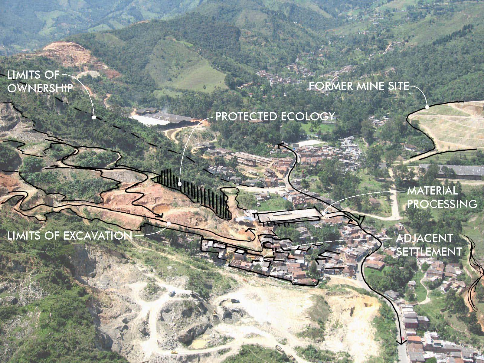 To continue on the same theme as yesterday, the poorest people in Medellin look to build their homes on the cheapest land, often free land or land illegally occupied. On the Southwestern fringe of Medellin much of the land is currently used for material exploitation, mineral exploration or strip mining. Sometimes these two forces converge and informal neighborhoods spring up in or around abandoned mine sites. The opportunity exists for a more controlled process of transitioning between strip mine and neighborhood development.