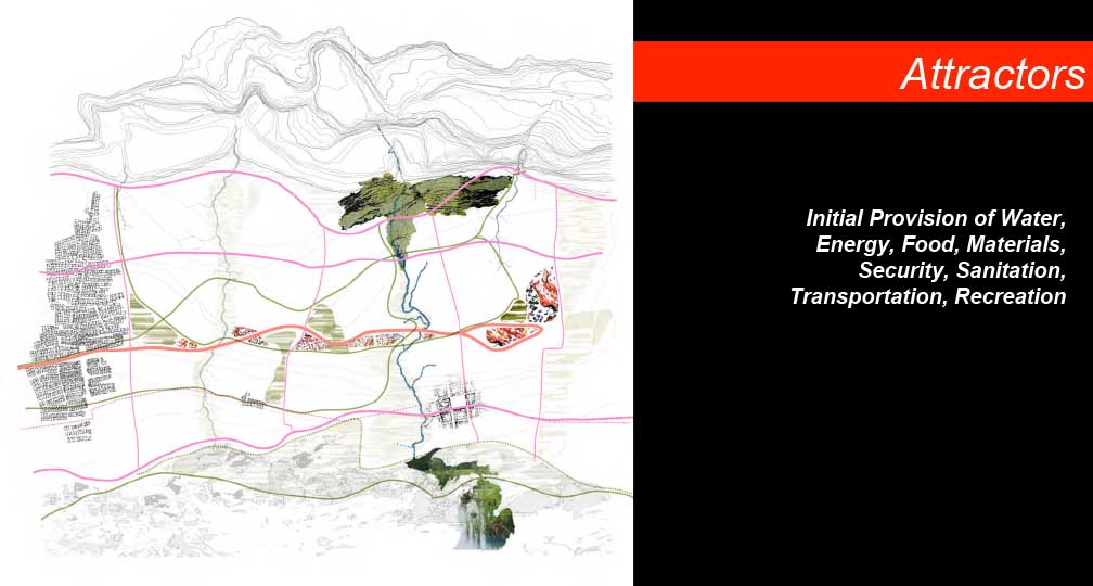 David Gouverneur, a Landscape Architecture professor at PennDesign in Philadelphia, has spent much time and energy exploring the problems, possibilities and characteristics of informal settlements (as discussed a few days ago). His research has focused on preemptive design of areas of city expansion, in contrast to retroactive improvement of informal settlements, sometimes called “acupunctural” interventions. (For a more thorough look at both Gouverneur and Informal Armatures see the Q & A: David Gouverneur invterview.) Note: in this context the word “armature” should be considered in the sculptural sense of the word, as in the wire framework around which a piece of sculpture takes shape. Informal Armatures would constitute public infrastructure around which self-constructed settlements could arise.
