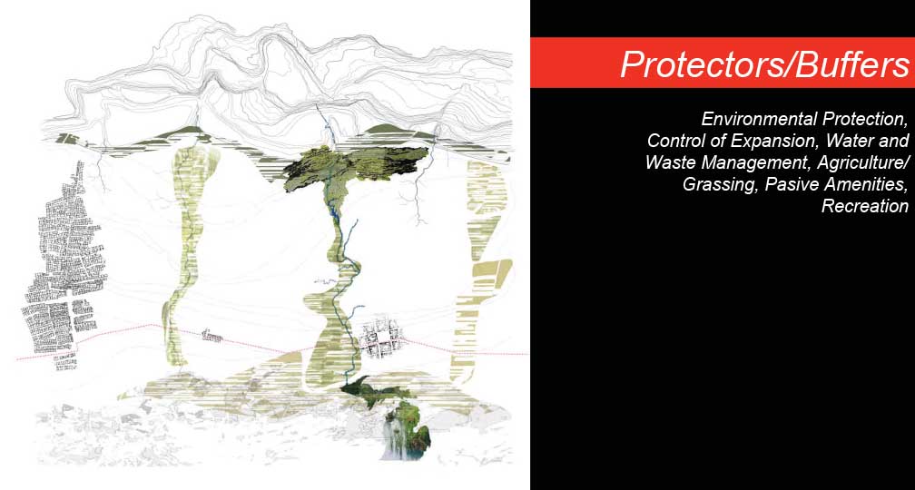 Of particular interest is step four, the “initial strands/components.” These are defined by 1)Protectors/buffers, seeking to protect specific pieces of land from development; 2)Attractors, resources and amenities serving future development; 3)Productive patches, economic drivers or public uses; 4)Neighborhood patches, areas intended for self-constructed settlements; 5)Custodians, public stewards managing the settlement and enforcing protector patches and buffer zones.