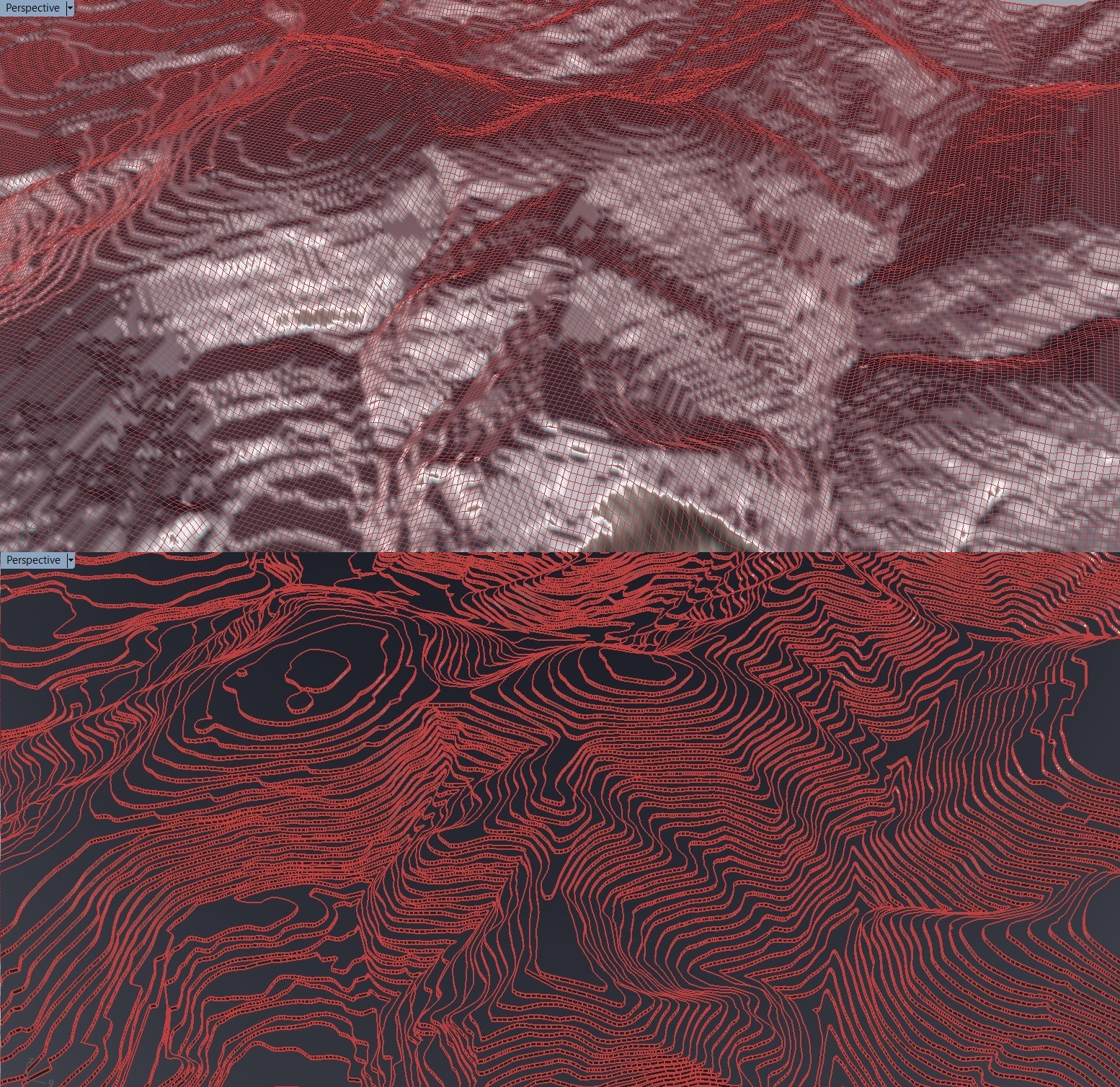 The reason I mention all this is to explain a small epiphany I had after spending an entire semester looking at and adjusting topographic lines. Topo lines are both incredibly precise and incredibly abstract, representing a line which, shorelines aside, are rarely if ever experienced. When designing land forms, manipulating the earth in some way, topo lines allow for the precise adjustment of the earth’s surface. Below left shows the same hillside as defined by a single surface (top) and topographic lines (bottom). The middle image shows the quarry site in Altavista, Medellin and defines slope as a gradient, with the darkest areas being the steepest slope. On the right is part of a diagram showing changes to topography, as most of the design work ended up being done via adjustments to existing topo lines.