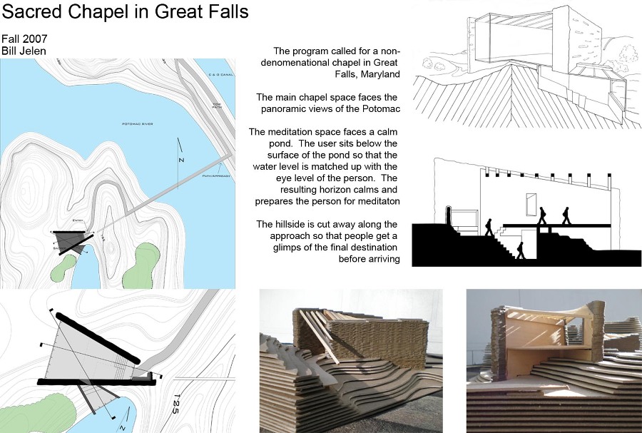 The next project was a religious space to be located in Great Falls, a national park just northwest of Washington, DC. (a brief description can be found on an old portfolio spread, below).