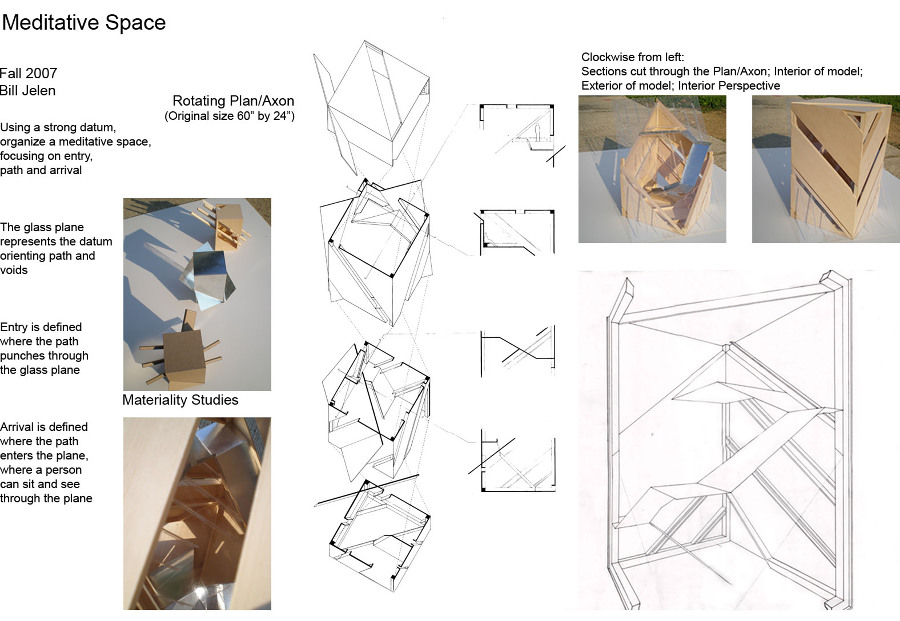 First we have a very nebulous, ‘foundational’ prompt, asking students to take phrases like “nesting”, “layering”, “datum” and arrange a kit of parts of geometrical solids to reflect this theme/organizing principal. I tried to think of the word datum as orientation, looking at how a skewed datum intersects with and influences a very rectilinear (box-like) space. As the project progressed, ideas of entry, path and arrival had to be incorporated into an experience to be had within the space. The glass plane represents an organizing force, orienting the window openings along the exterior. a metal path enters and cuts through the glass, turning, and arriving to a space of reflection, with seating arranged to allow a person to sit and rest, suspended within the glass.
