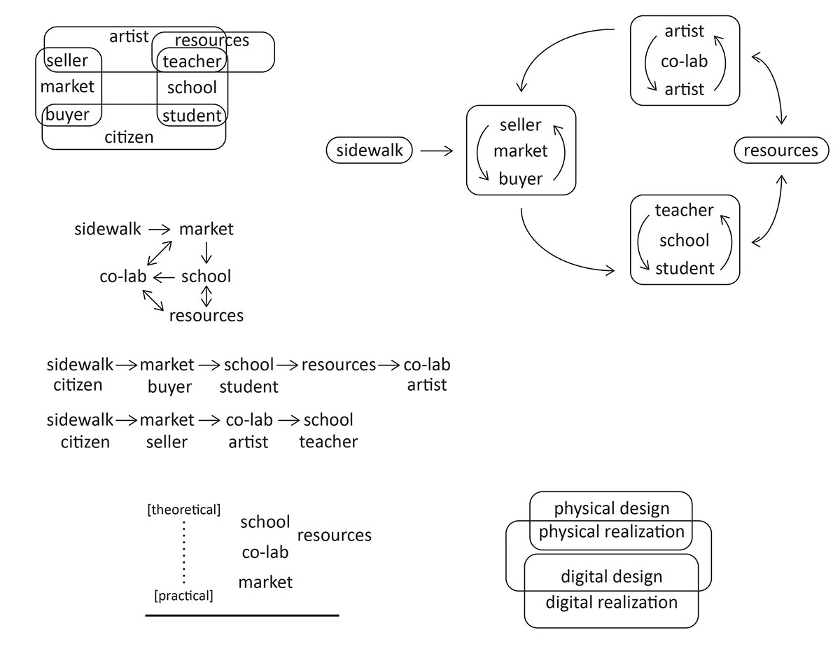 To this end there is also a logic to the way a passing pedestrian could enter the market part of the program, become a buyer, sign up for classes and become a student, learn enough to start producing work at the co-lab, selling it at the market, and eventually becoming a teacher to new students. This continuum offers a way to structure building layout strategies but is by no means deterministic. This, to me, is a necessary quality of any diagram.
