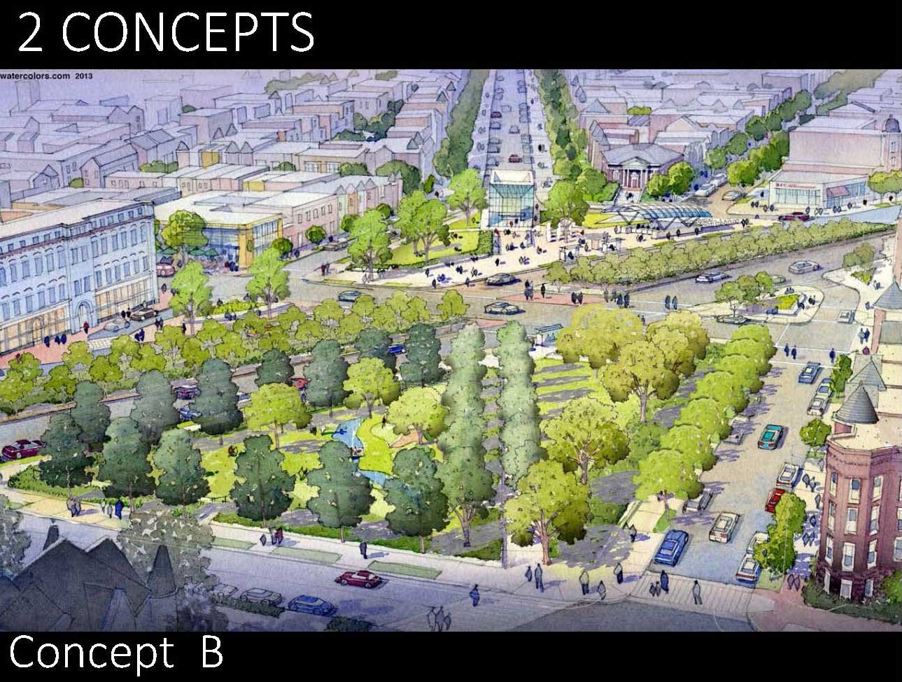 Barracks Row is a stretch of 8th St SE running between Pennsylvania Ave and the Navy Yard, and has been a “Main Street” for a decade. A few years back they served as outside consultant (faux-client) for a school project at CUArch. That project, the Eastern Market Plaza, proposed a small welcome center kiosk anchoring a sloped lawn and communal gathering space. This past year the Barracks Row Main Street presented two master plans for the entire plaza (6 irregularly shaped blocks) which can be found on their website here. They are taking public feedback until the 15th of this month. The feedback website looks like this: