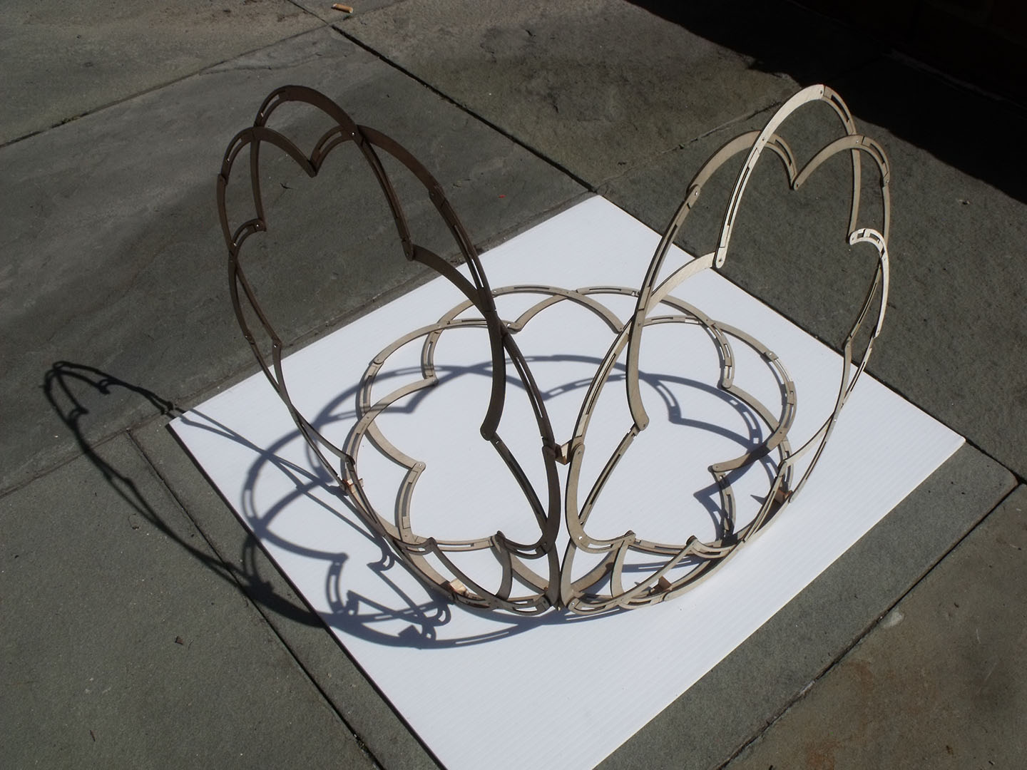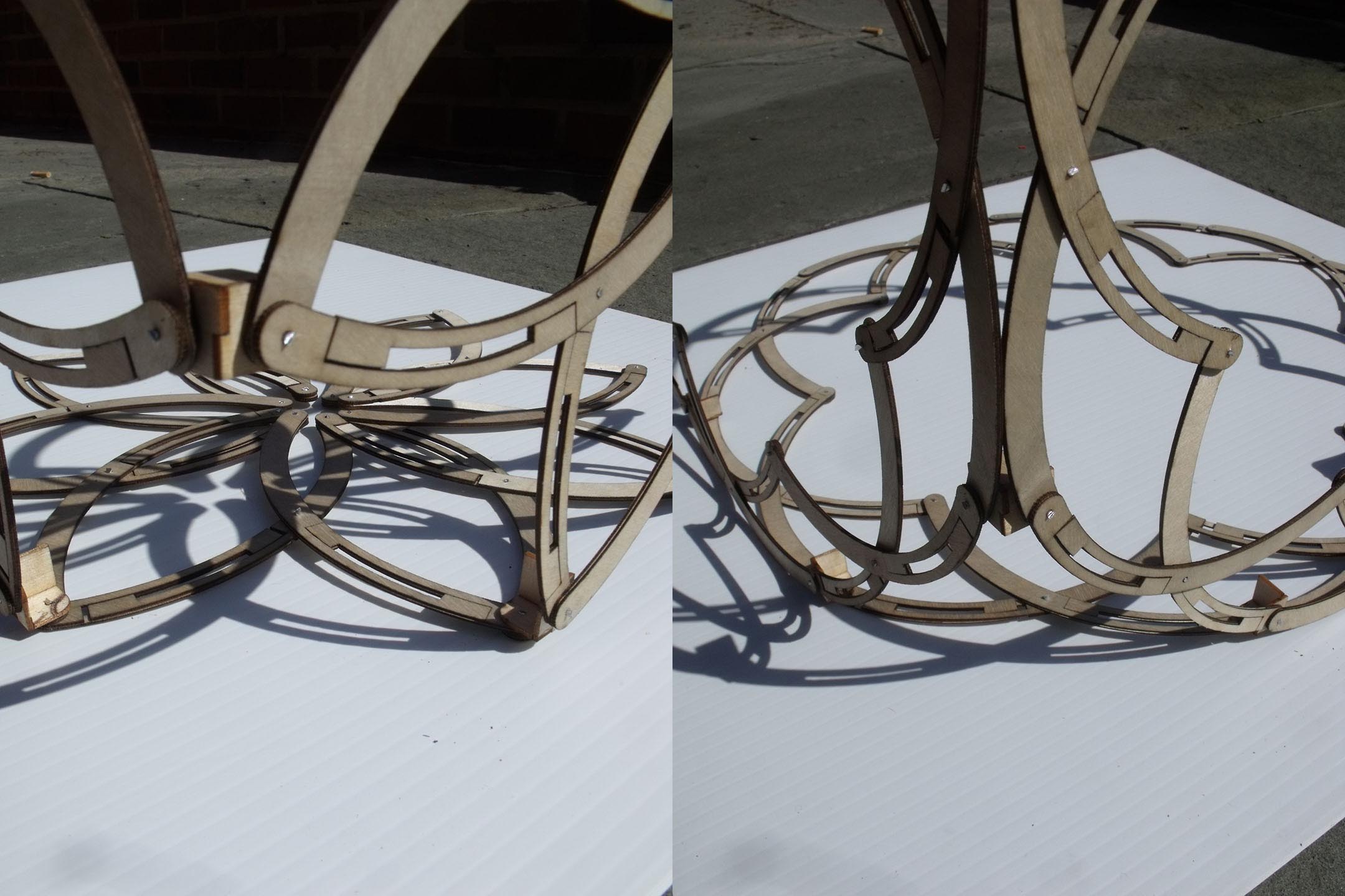 This last project was only partially complete due to dissatisfaction with the technique of using the scissor joint along the face of the volumes. These faces change dramatically, and offer some interesting floral/gothic language. In the end, however, there was not enough expansion between ‘closed’ and ‘open’ positions. Tomorrow Steve and I take a different approach to the problem of space filling deployable structures.