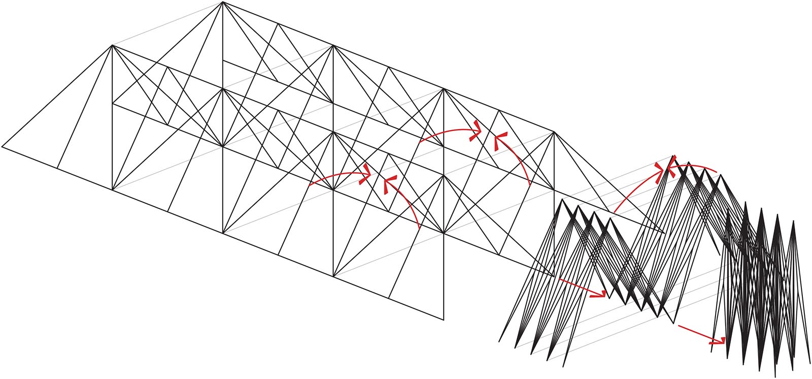 The last graphic shows how the very planar truss could be organized in to a space frame, and if you look closely you can see all the square pyramids and tetrahedrons which make up the space filling geometry.