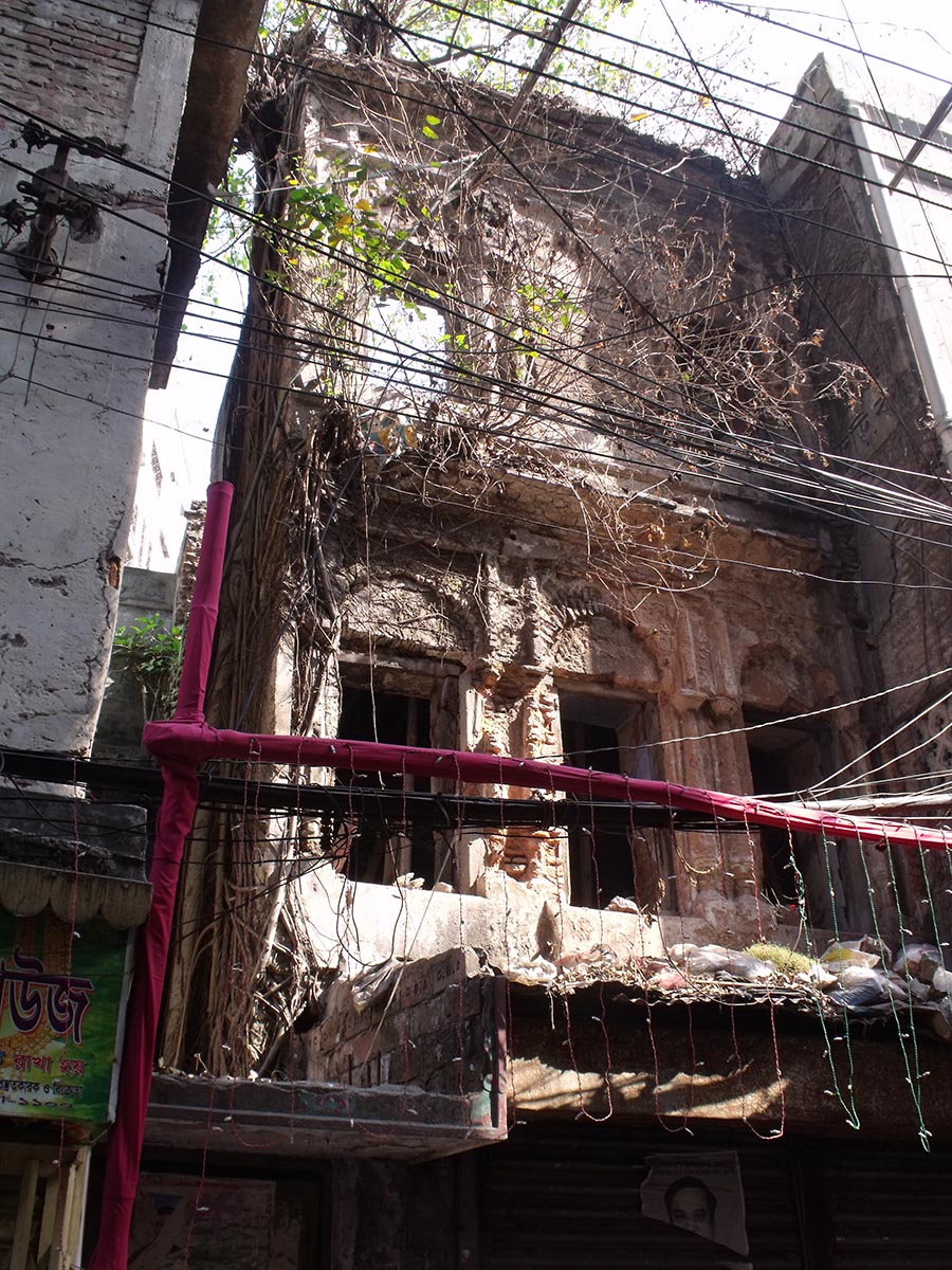 This building is from Shakhari Bazar in Old Dhaka. Many of the buildings had either been subdivided to accommodate growing families or combined to capitalize on high real estate values. The city has been trying to impose historic designation on the neighborhood for a few years, thus far with no success.
