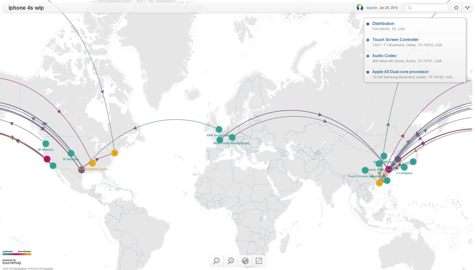 ‘Out of sight, out of mind’ applies often to most of the goods we buy. Everything I own or use has had a long life before it got to me and will likely have a long and much more sordid life after. As abstract concepts, it is easy to understand that the cell phone in my pocket traveled a long way from many different source points before I began using it. Two projects in particular are investigating ways in which these abstract ideas could be made specific and visual. Sourcemap.com offers a platform for mapping out supply chains of anything from clothing to electronics to sports teams. Below users ‘tanger 8’ and ‘dejardin’ mapped out the Samsung Galaxy 4s and the iPhone, respectively.