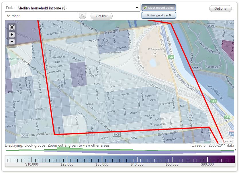 In West Philadelphia the Belmont neighborhood is defined by Lancaster Ave to the south, 40th St to the east, Belmont Ave to the west and the Septa tracks to the north. These four borders give definition to a place and a neighborhood. Depending on who you ask, this area could be considered part of Mantua, and is part of the recently (January 2014) announced Promise Zone, a new government program trying to improve neighborhoods by fast tracking applications for federal grants and loans. As someone who has never lived in or really spent time in Belmont, I can only judge how badly it needs improvement based on articles (“City officials and neighborhood leaders say the area is poor and crime-ridden” from the Philadelphia Inquirer) and maps of various statistics (income, education, long term residents, transit usage shown below).