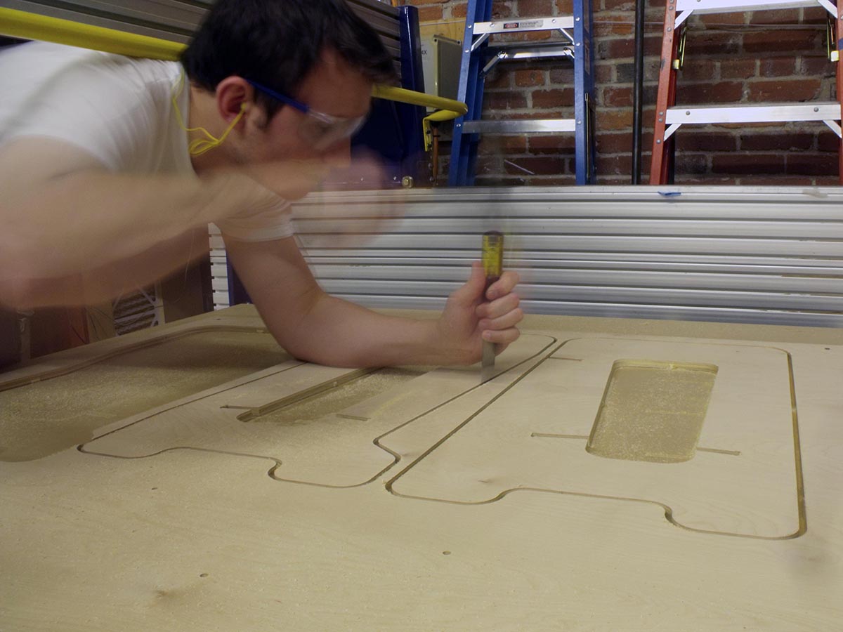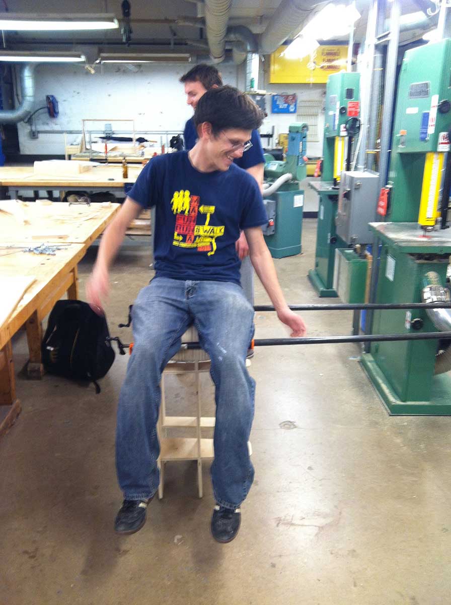 Continuing from yesterday, the stool was fabricated in a mad dash after hours during the last week of school last spring. We had access to a CNC milling machine at a local fabrication shop and hired the help of a fabricator. My favorite memory involved catching a bus from the fabrication shop at midnight with a contractor bag full of pieces of plywood, looking like a sinister Santa Clause delivering pieces of stool. Special thanks to Alyssa Olsen, the engine which drives Co-Lab, Alex Holstein, who came to help out after a full day of work at the office, and Peter Martinez and Jonathan Dessi-Olive for assembling the furniture.