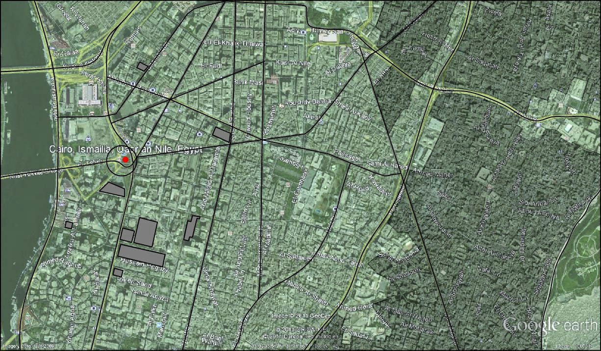 Tunis’ protests tell a similar story. A town with a historic medina goes through an intense period of expansion which introduces a number of orthogonal grids radiating out from the old city. The homes of government palaces, ministries and other institutions are found in this euro-style new city, and the wide and grand boulevard connecting all these seats of power become the place of choice for protesters to congregate and voice their displeasure with the powers that be. In Cairo, protesters almost happened upon the large traffic circle called Tahrir Square, which is not a public square in either the traditional western or Islamic sense of the word. It is, however, a product of western planning and within close proximity to a number of high profile government headquarters (and much further away from the old city). Figure three shows Tahrir Squares’ (red circle) location in comparison to a number of ministry buildings and the old city.