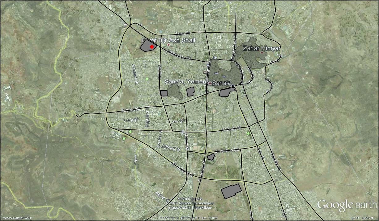 Sana’a offered protesters many open spaces to camp in, however police maneuvering pushed these gatherings to the outskirts of town at the campus of Sana’a University. The campus’ suburban layout offered ample space for a protest camp, but also found itself outside the city grid (old and new) and out of sight, and earshot, of most of the city (including President Saleh)(see figure four). While this protest camp provided a home base for the civil unrest, it is arguably the impact of smaller and more violent skirmishes within the city proper which had the most influence on domestic and international sentiment. For protesters in Manama, Bahrain, their choice of location was similarly on the outskirts of town, but benefited from the iconic landmark of the Pearl statue located in the Pearl Square. Like the other protests mentioned, Pearl Square is a product of western urban planning and is located closer to western style neighborhoods and block grid systems (which, similar to the other cities, is home to government headquarters and international banks) than any neighborhoods of traditional Islamic urban fabric.