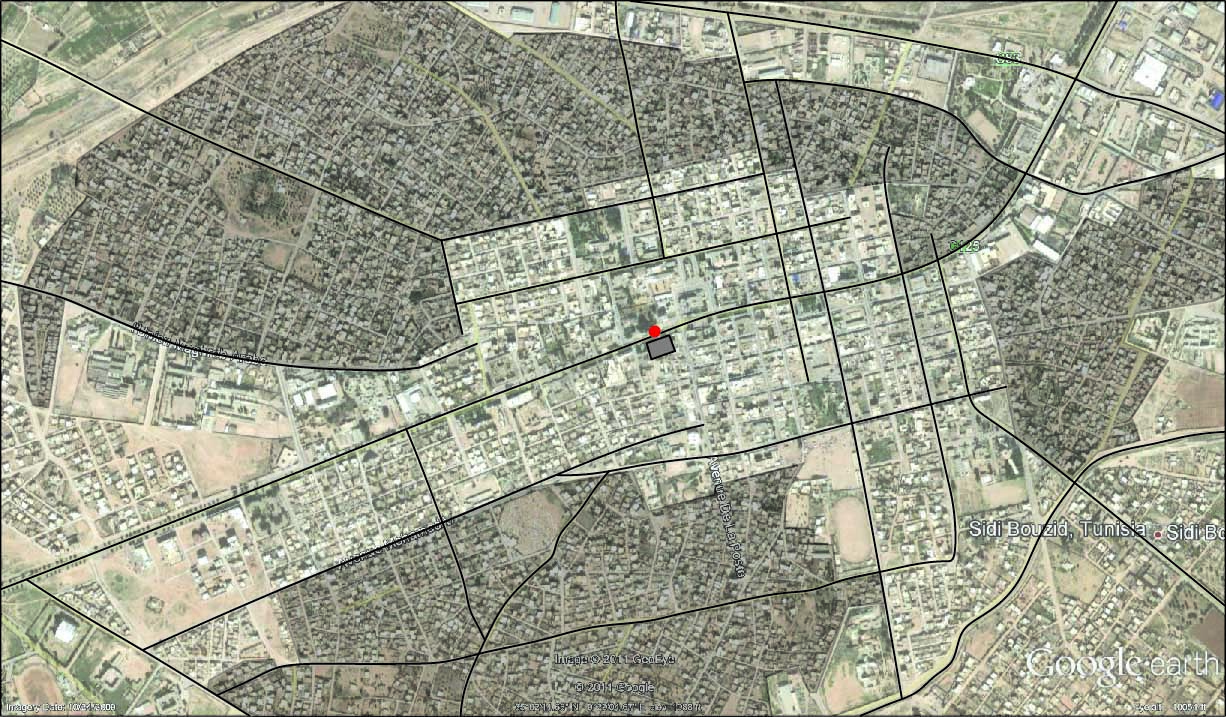 In Sidi Bouzid the location of protests was determined by two factors. One, where Bouazizi decided to set himself on fire (the local seat of government) and two, where the local seat of government decided to situate itself within the urban fabric. Bouazizi’s and subsequent protests occured outside the provincial headquarters along the main boulevard of Sidi Bouzid (since renamed in Bouazizi’s honor). The building is located in the middle of town, the physical and political center of life there. It is also within the central downtown neighborhood, notable for its rigid orthogonal grid layout, similar to cities such as Chicago, Philadelphia, and hundereds others spanning six continents, similar to the western style urban planning described by Bianca.
