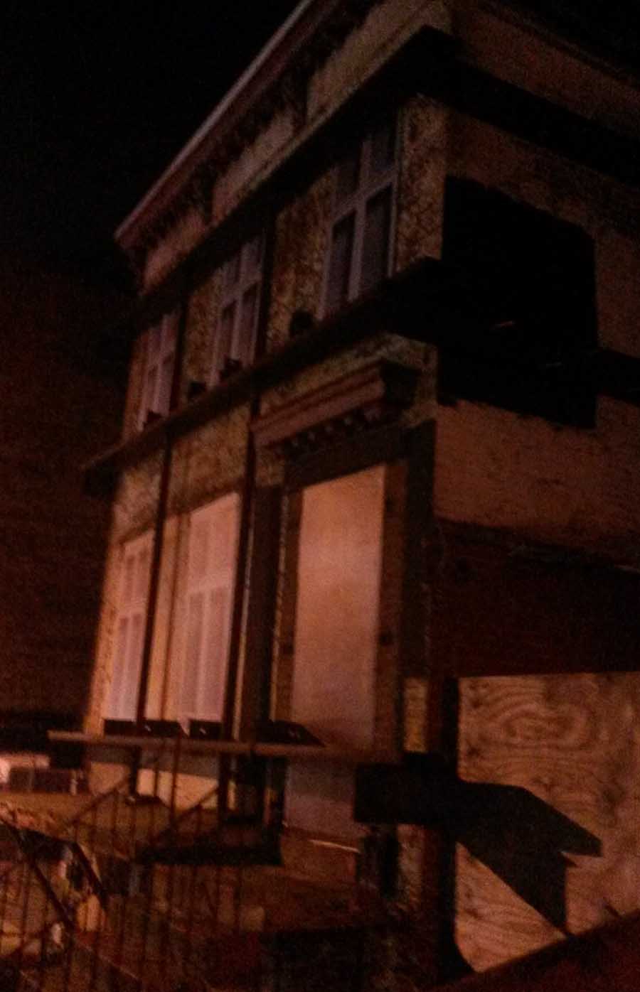 The two story structure is braced externally by steel, and the windows and doors are boarded up with plywood, plywood that has been pasted over with images of pristine wooden doors and shutters. A storefront around the corner has similar treatment.