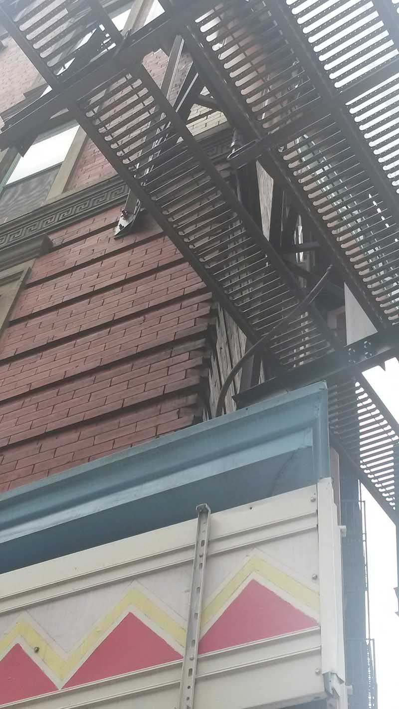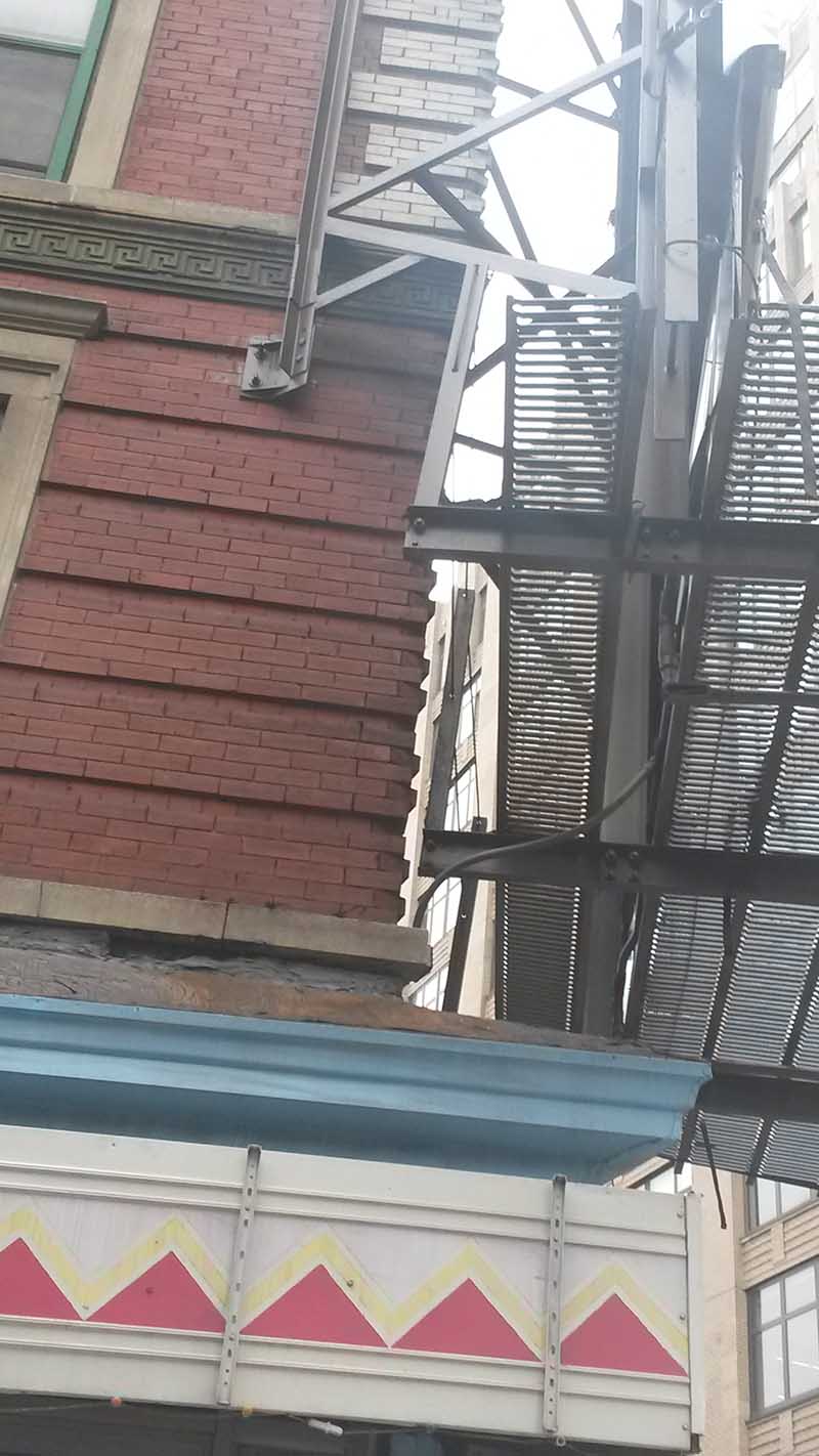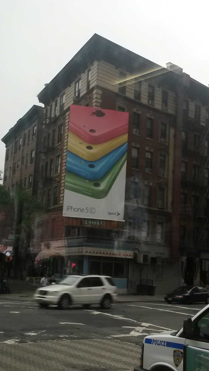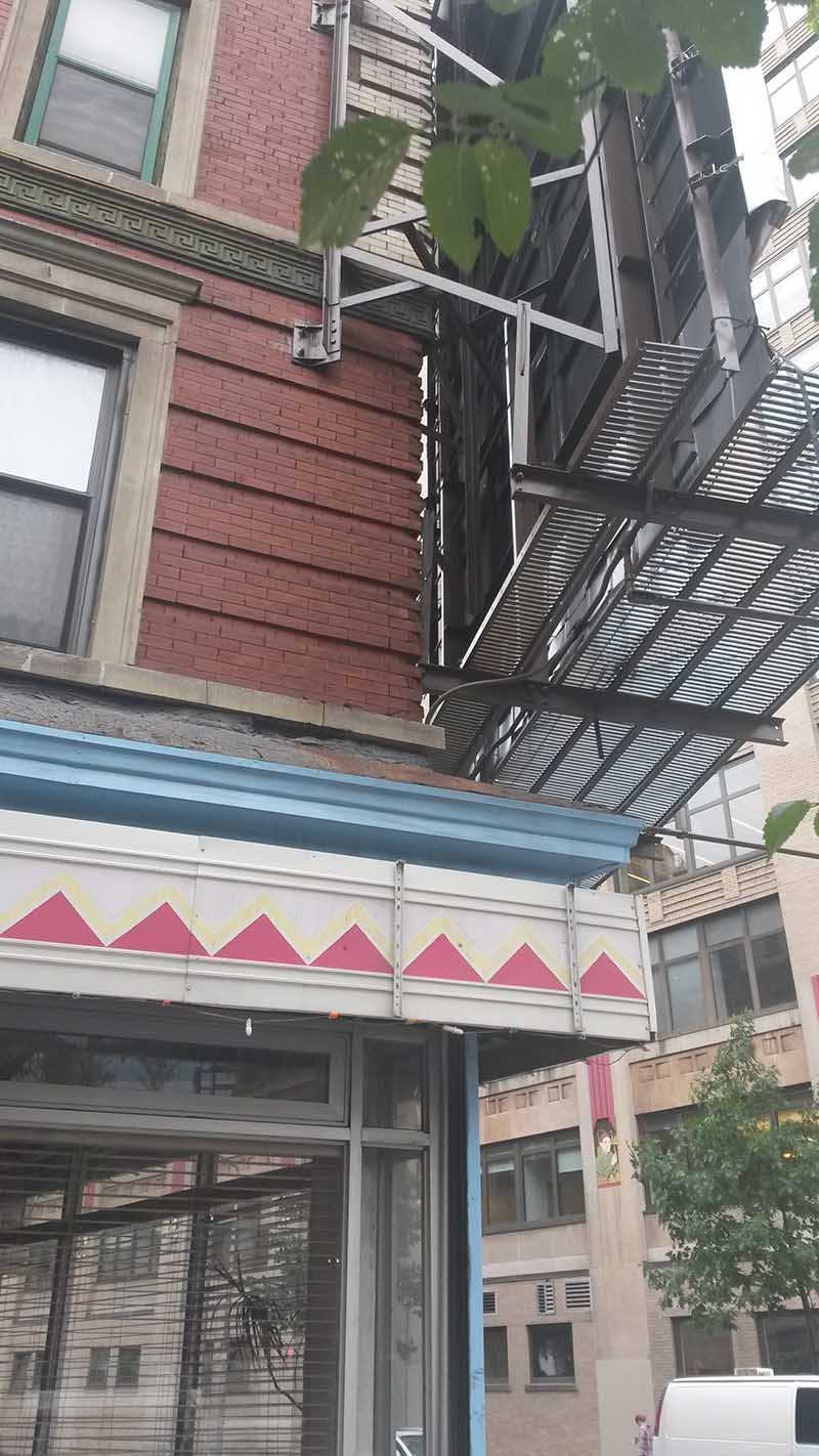 The 200′ by 600′ grid of Manhattan is broken and carved up by a few avenues, with this building here on 6th Ave in Soho. The street grid is a bit skewed, resulting in an acute angle at the intersection. If you look closely, behind the giant billboard, you can see the brick courses meeting at the corner.