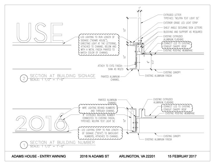 Completed in 2018 and in partnership with Parima Sukosi, we provided design services to the Adams House (Arlington, VA) condo board for the renovation of their main entrance canopy, signage and lighting. We reviewed original construction documents and proposed exposing the existing I-beam supports of the canopy, and a painted perimeter C-Channel fascia to replace the existing green canvas.