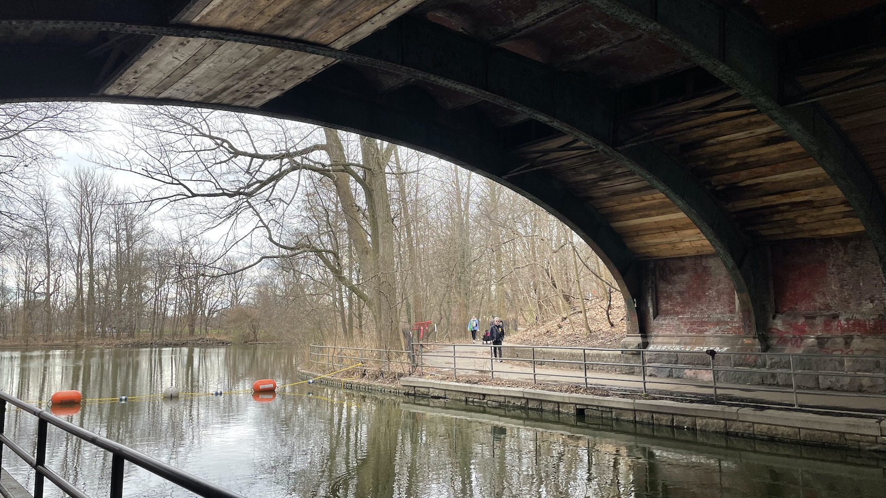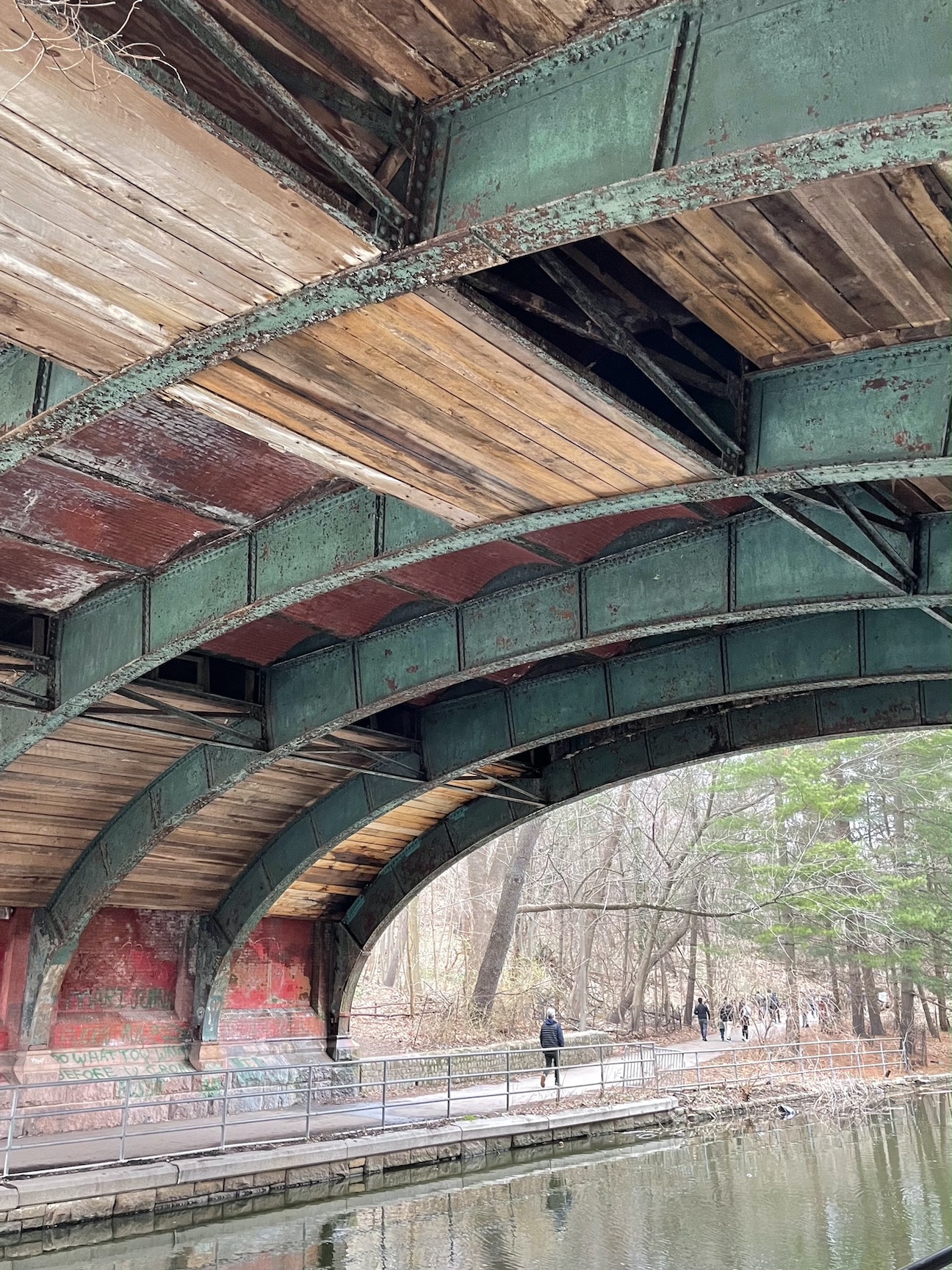 In the middle of Prospect Park lies the Terrace Bridge, supporting one of the two cross park roads which trisect the interior of the park. The 18 and 90 along the stone at either end of the arch refers to the year this steel bridge replaced a wooden one built in 1870. The NYC Parks Department website has a nice and concise history of the bridge and the original vision for this portion of the park – plans for an adjacent restaurant ended with the 1873 financial panic. I’m still trying to work out the significance of the wood lagging hung between the six steel arches, and why they would be used to hide the structural brick arches supporting the roadway.