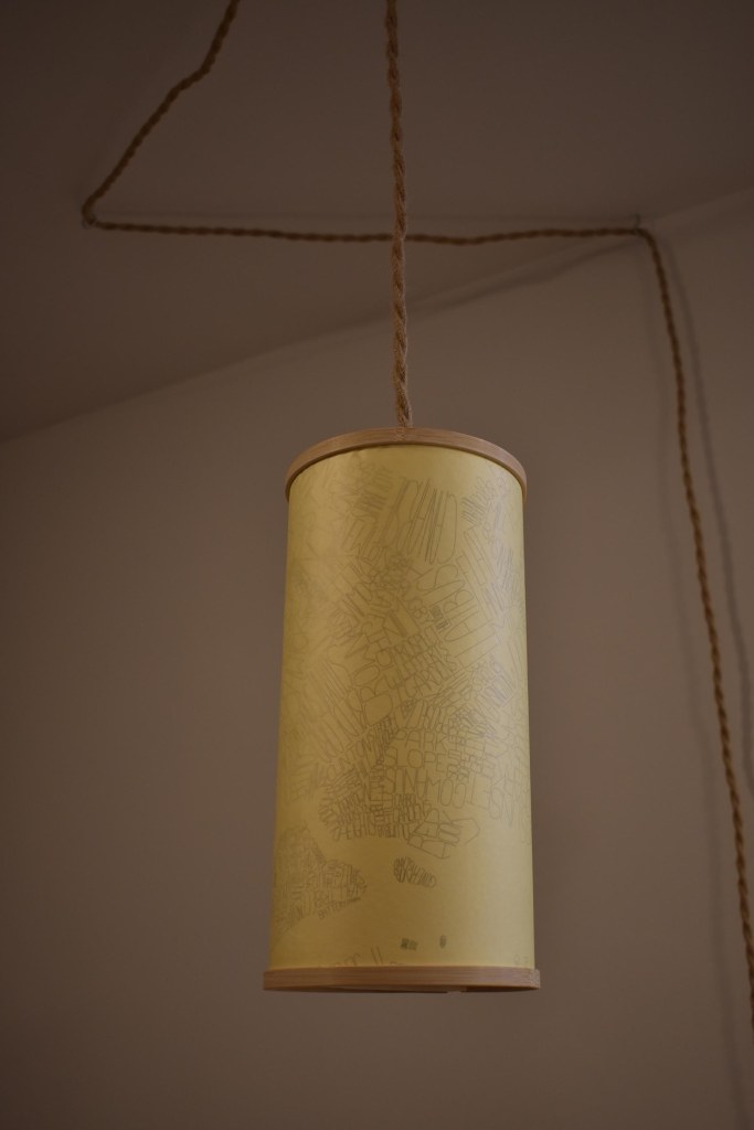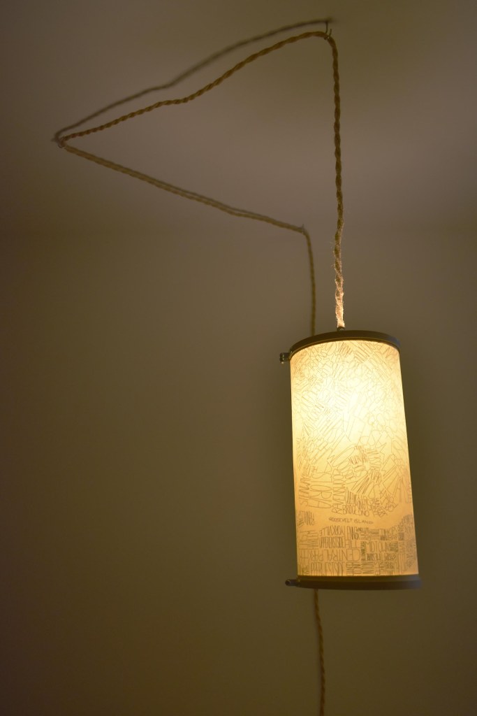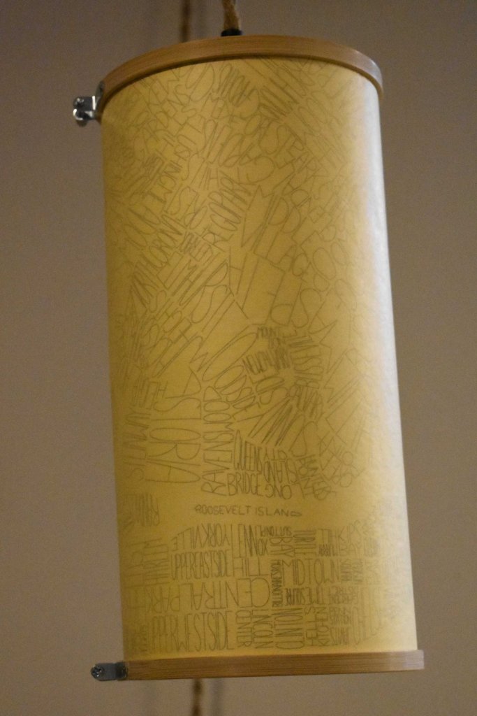 As part of a series of maps and sketches of neighborhood names and boundaries, I have started to make lampshades to hang from pendant light fixtures. The shades are made of trace (in the example below the trace is sandwiched around simple printer paper) held in shape with an embroidery hoop on either end of the cylinder. The top hoop incorporates bamboo rods (chopsticks) to balance the shade from the light socket. (This aspect needs a rethink to allow adjustment and balancing the light.)