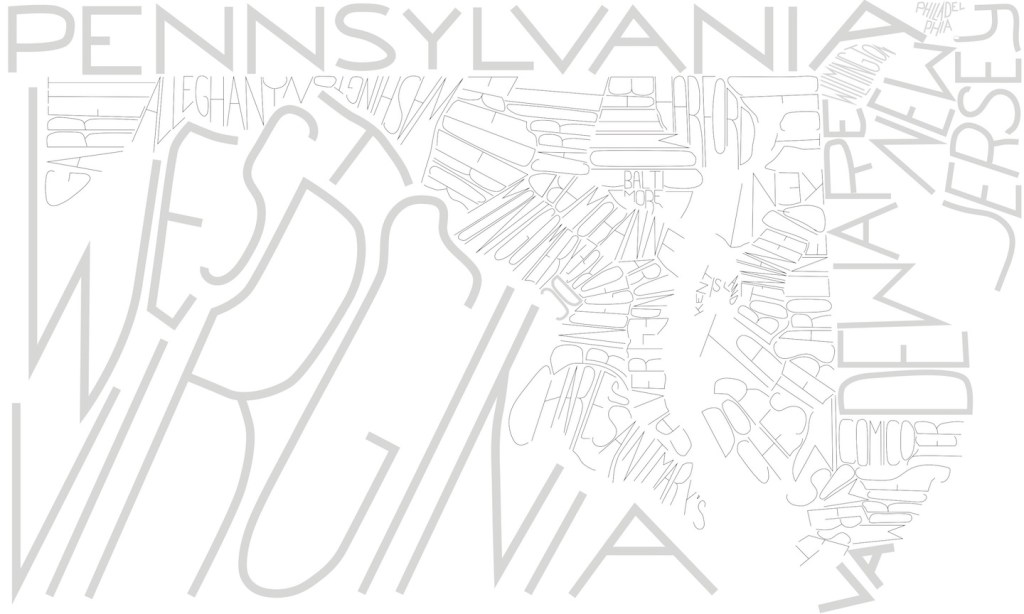 I’ve explored this same ‘map of names’ technique to show the counties of Maryland and the townships of Rhode Island, see below. Both images are proportioned with an eye towards making other lampshades, or simply making wall prints.