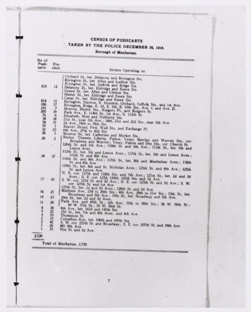 6/11/2024 post-script: searching online for historic images of pushcarts lead to the discovery of this 1916 census of pushcart vendors operating in Manhattan: