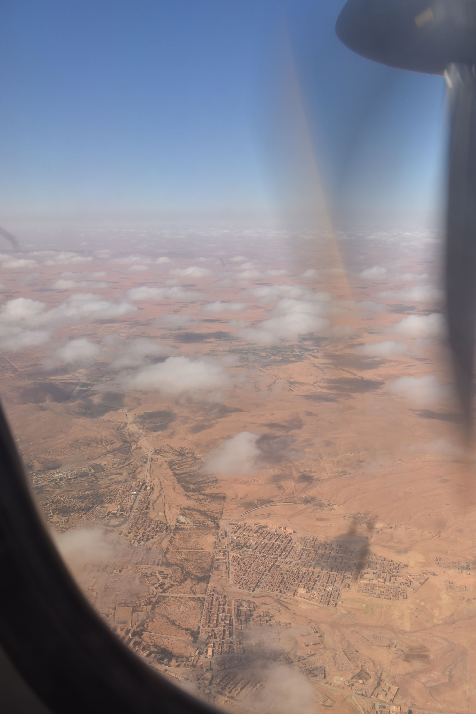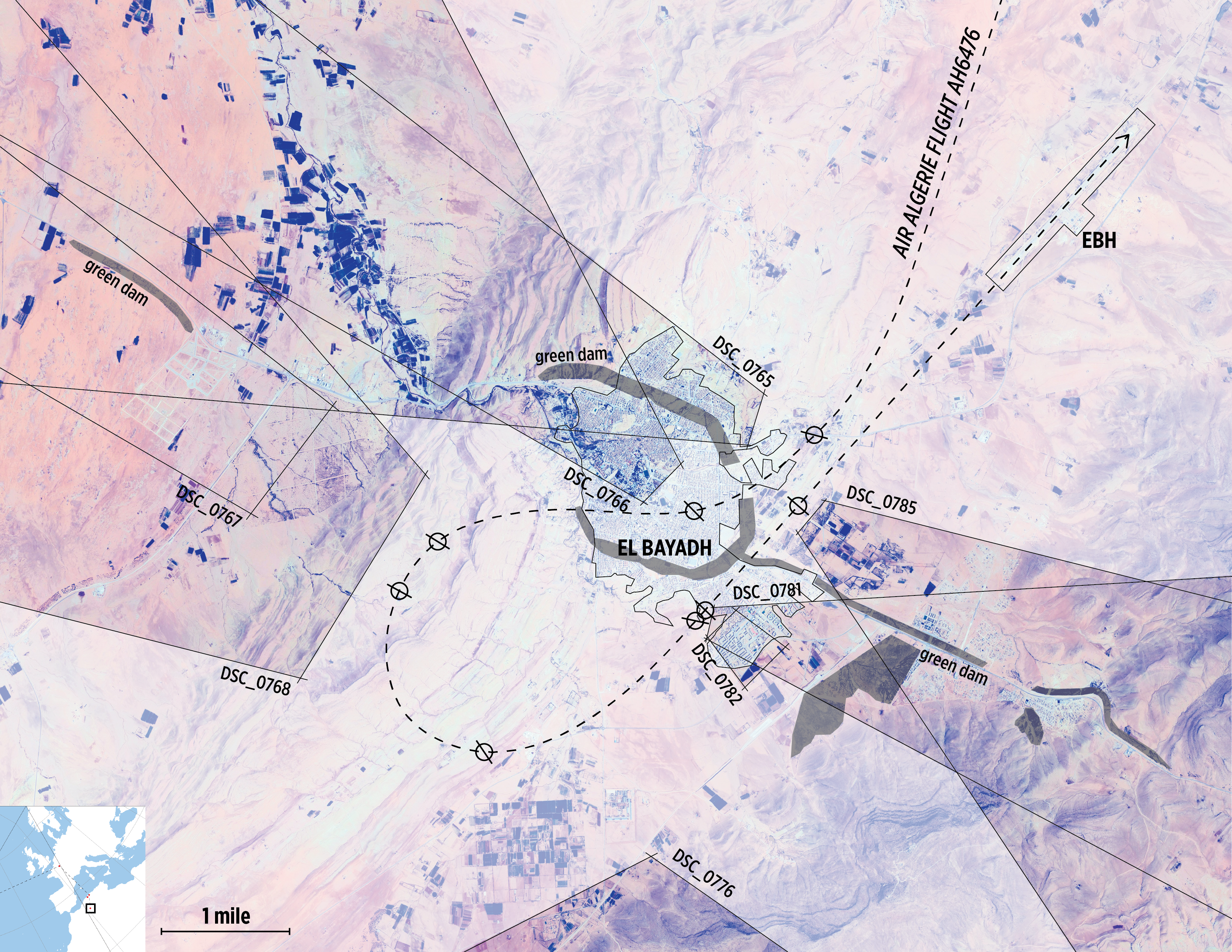 The previous post reviewed photographs taken from a flight from Algiers to El Bayadh in February, comparing the bird’s eye view from the plane to the God’s eye view of satellite imagery. As the flight approached El Bayadh we took a loop above the city in order to approach the airport from the south. Based on the photos taken and the view of El Bayadh’s surroundings from satellite imagery, the estimated flight path is shown below: