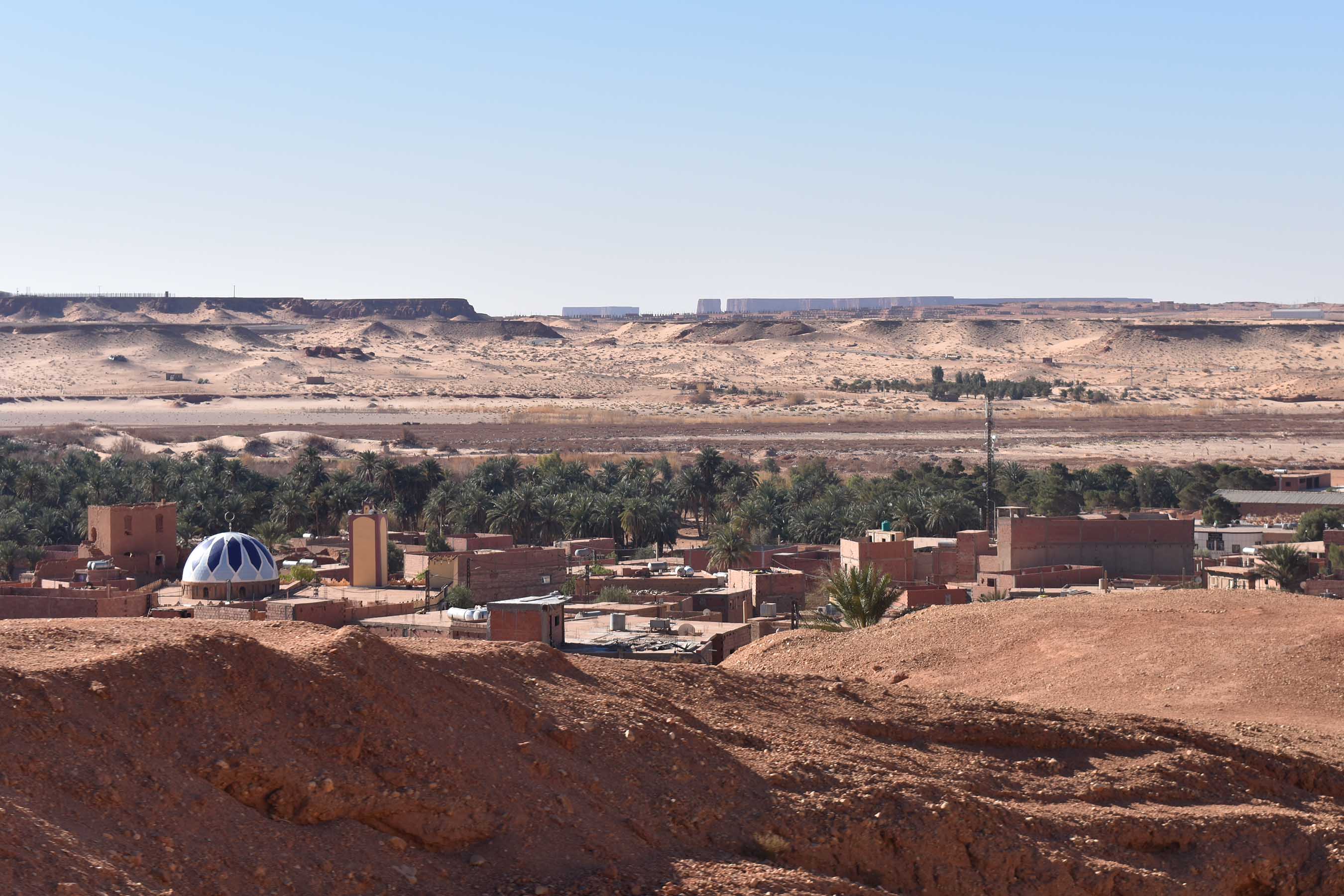 The Brezina oasis, with reservoir to the north and mesa formation to the south: