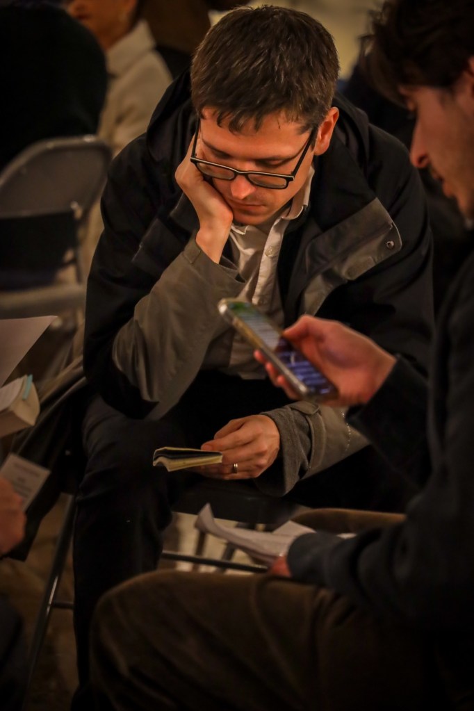 The group then split in two – half remaining inside for prompted conversations/interviews in pairs. My group ventured outside but first read an excerpt form Georges Perec’s An Attempt at Exhausting a Place in Paris (pp 5-6). Step one – venture out into the neighborhood (DUMBO) and find a spot to sit. Step two – observe the ‘infraordinary’ and take notes. Step three – return indoors and share notes. Attend to the sense of place you create in the collective. My notes: