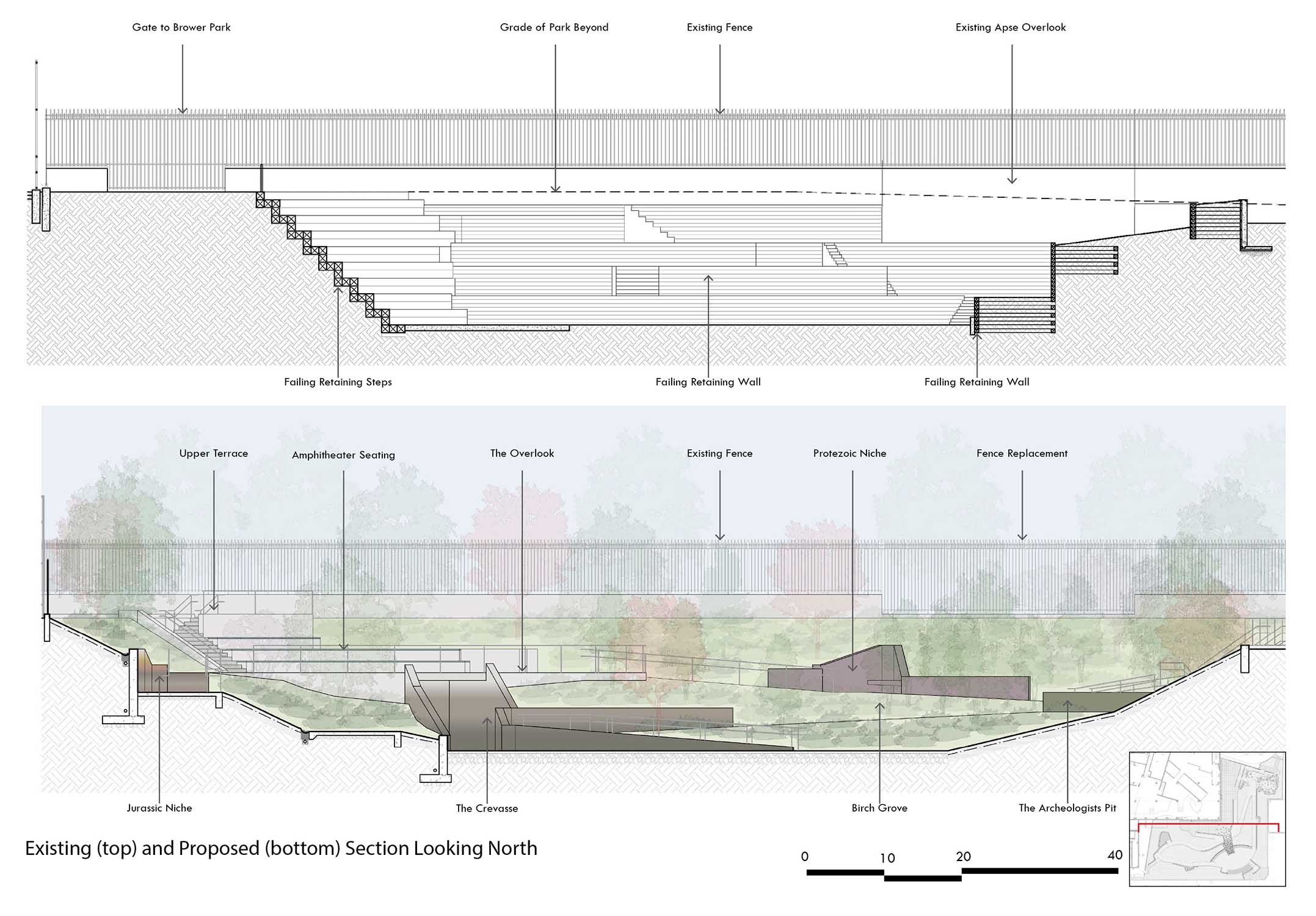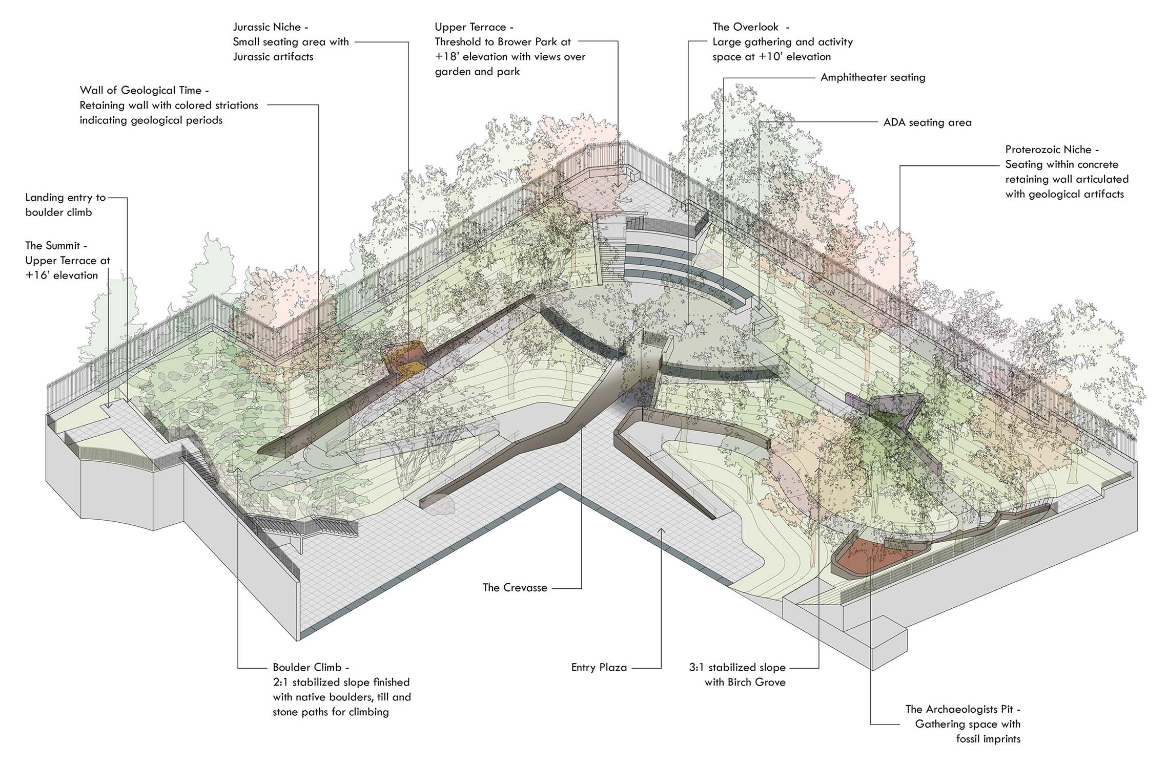 Under the guidance of the NYC DDC Design Excellence program, this project is a renovation of the damaged and failing retaining walls of the Brooklyn Children’s Museum Garden. The project sought to replace the poorly draining courtyard with a ‘high performance’ landscape of geo-grid reinforced sloping soil and plantings to provide a space for outdoor learning at the museum. Geological site features such as boulder erratica and crevasse reference the themes of the museum’s permanent exhibits.