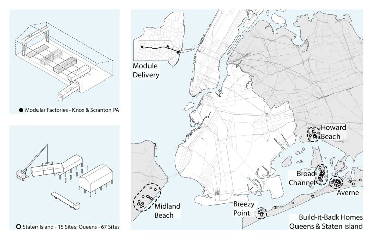 To expedite Superstorm Sandy recovery efforts in Queens and Staten Island, Build-it-Back turned to modular construction. Gans & Company designed twenty housing prototypes which responded to specific Build-it-Back program guidelines, zoning regulations, and local fire code. These prototypes became 83 houses, with modules constructed in Pennsylvania and delivered and installed in coastal neighborhoods in Staten Island and Queens.