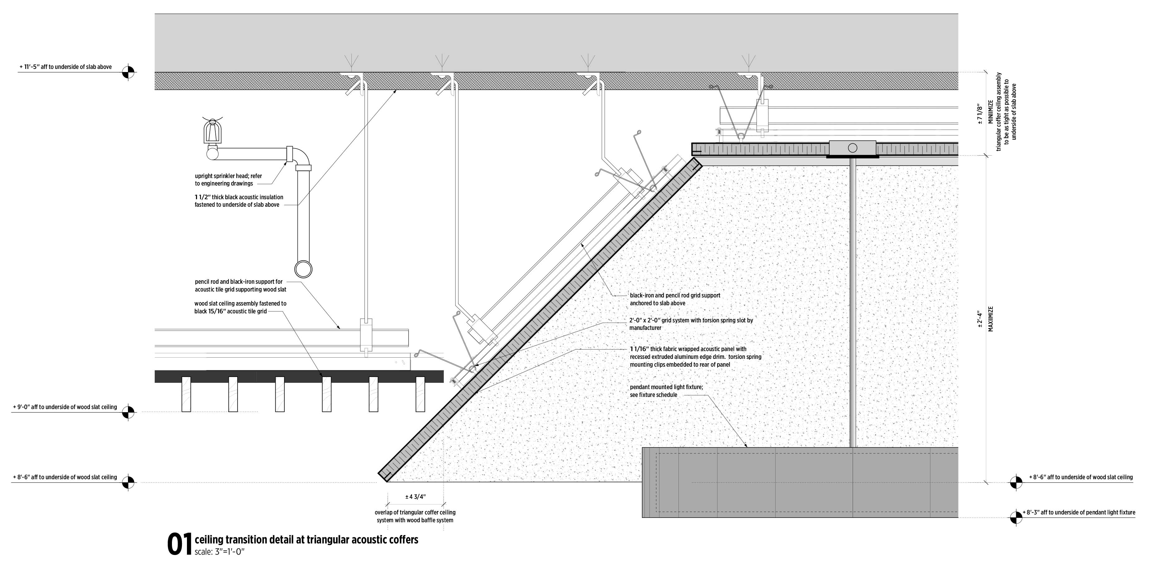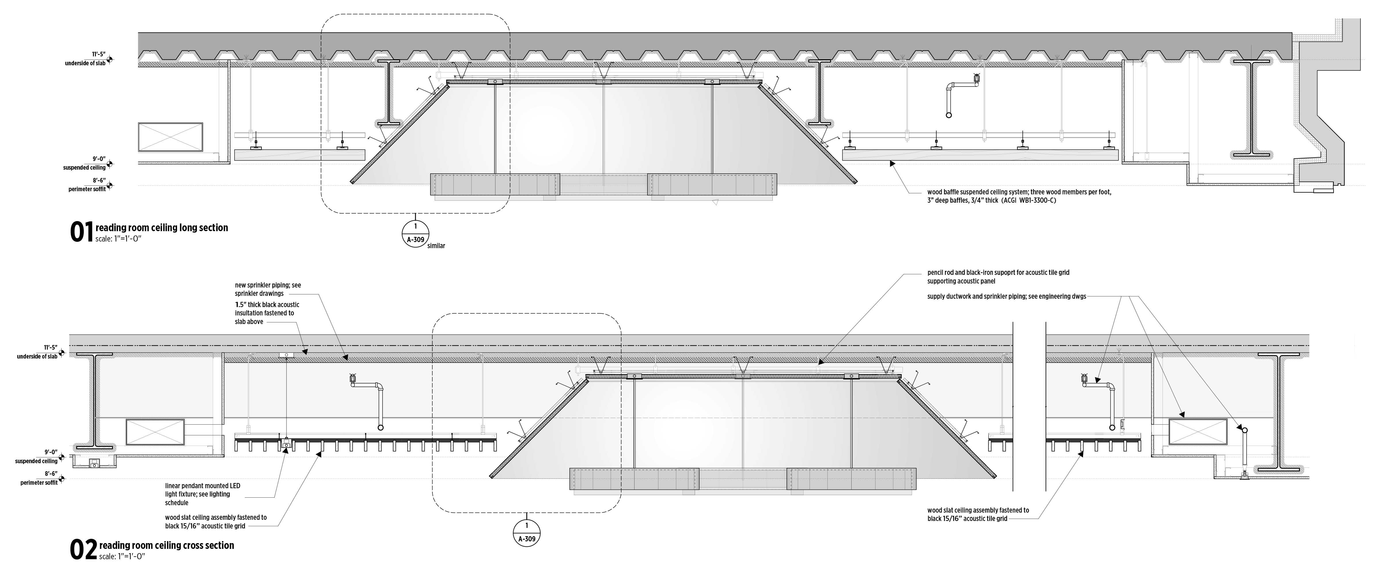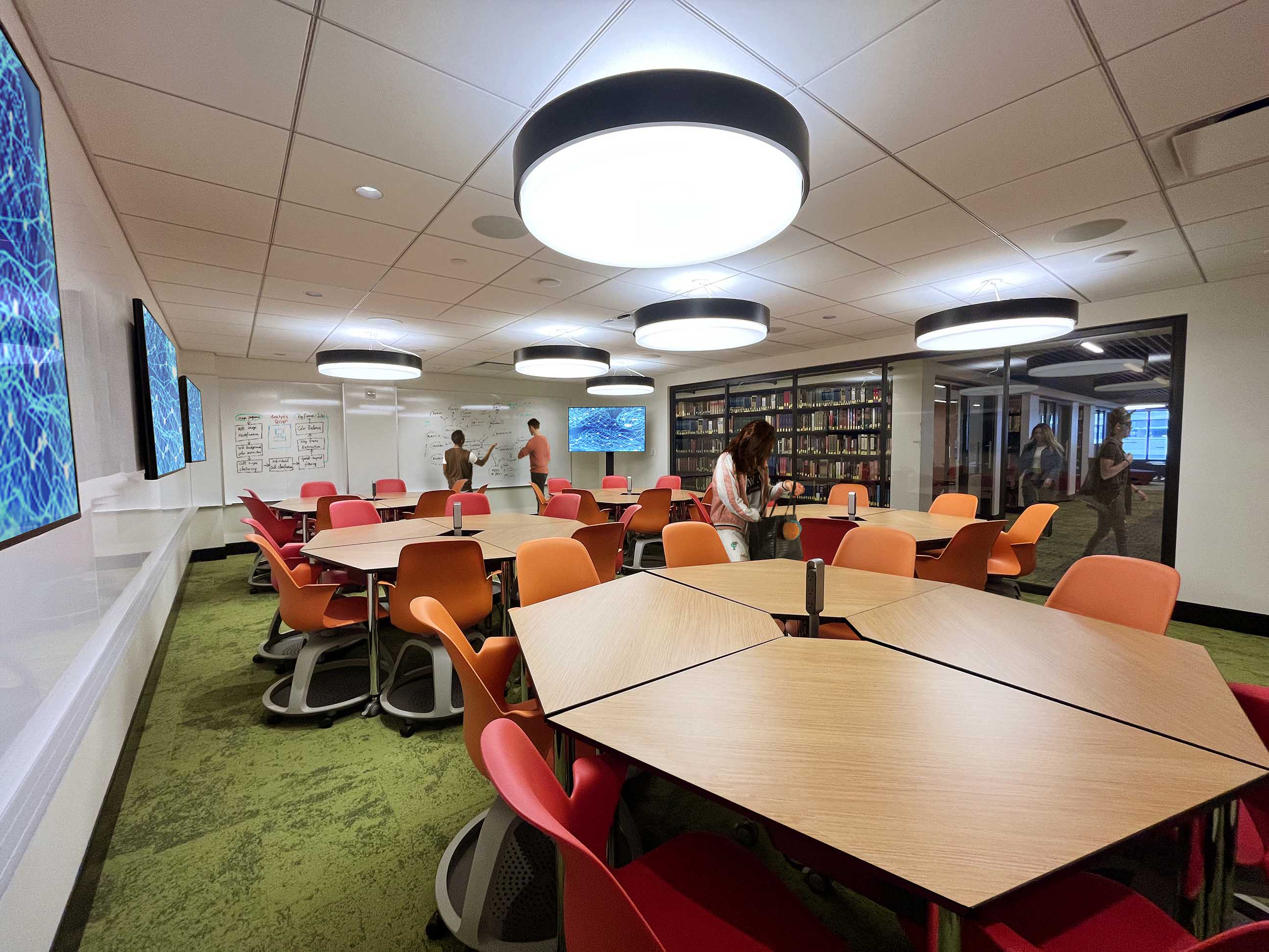 This 18,S00sf gut renovation was the first work done to the 5th floor since the library opened in 1981. Renovation work transformed the library with new programming for both students and faculty. The new floor triples the existing quantity of student seating while also including reservable group study rooms, two learning studios, workshop and conference space, a faculty resource center and library staff offices. Glass-walled “co-labs” anchor the reading room and feature three walls of whiteboard and tackboard with shareable touch-screen monitors. The glass walls give these rooms a performative quality inspiring curious classmates and voyeuristic passersby.