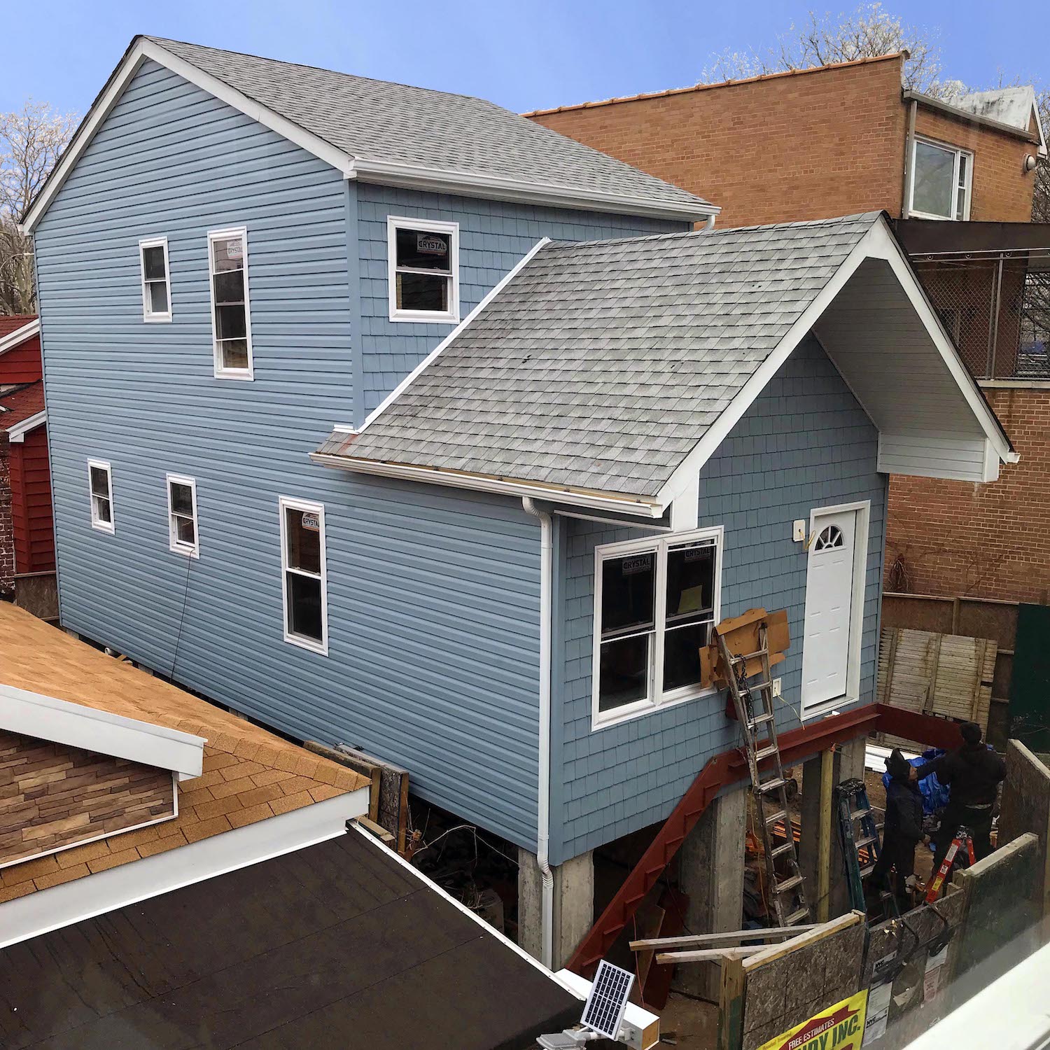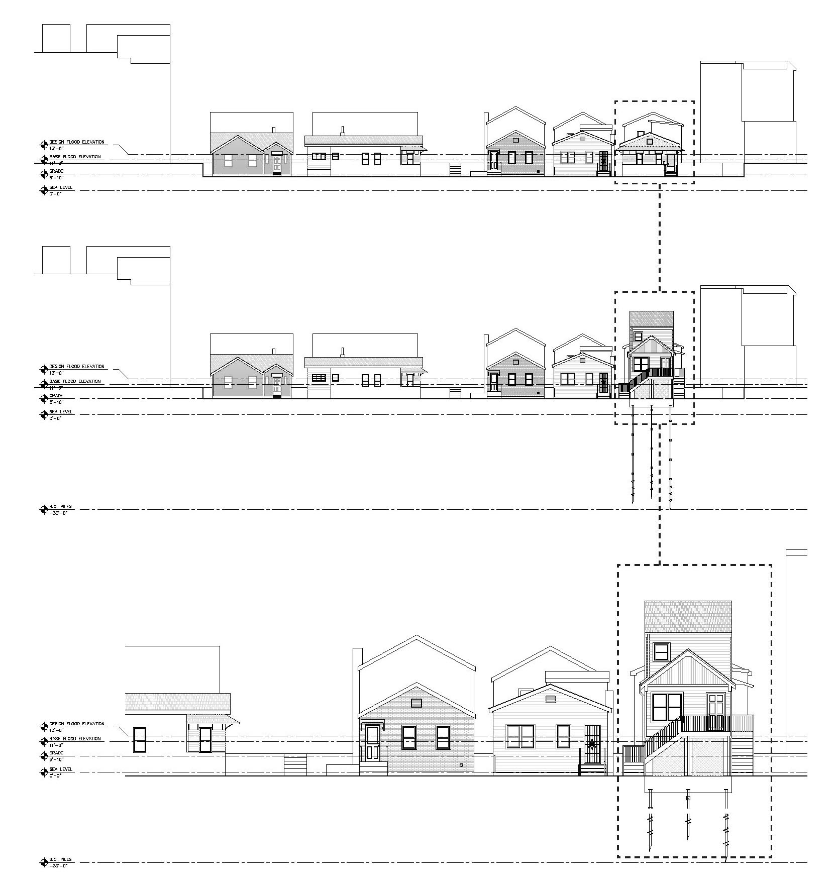 This home was the last Build-it-Back home assigned to Gans & Co in Brooklyn, and the first to utilize podium construction (a hybrid of steel and wood framing) to meet the restrictions of building in the fire district. Operating within the tight constraints of Built-it-Back, we were able to design a cathedral ceiling for the living room and an integrated front overhang at the home’s entrance. Flood zone restrictions required the home to be elevated 7’ off of the ground, and determined material use and plumbing infrastructure below the Design Flood Elevation. Poor soil conditions required the use of helical piles to support the concrete foundation.